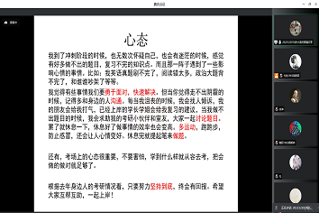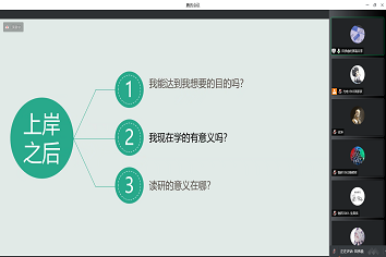 心理生涯服务中心于11月5日在线上通过腾讯会议召开了“剑指研峰”考研经验交流会,听取往届优秀考研生的经验介绍和方法指导,为有考研准备的同学提供经验借鉴。