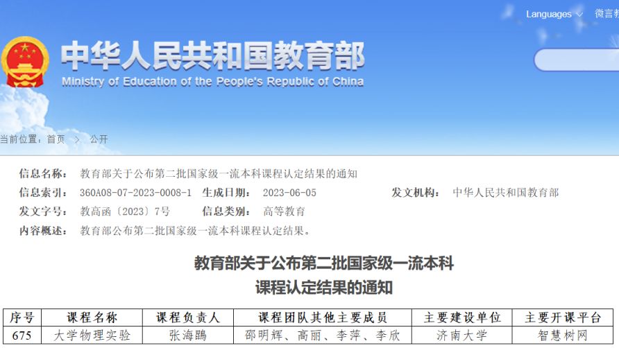 近日,教育部高等教育司公布了第二批国家级一流本科课程认定结果,由91官网 副院长张海鵾教授团队申报的《大学物理实验》获国家级一流课程认定,这是91官网 首门国家级一流课程。