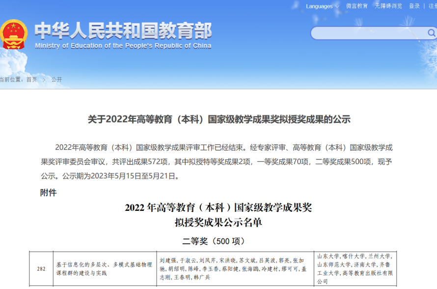 此外,根据教育部网站通知,张海鵾教授参与的一项教学成果被公示为2022年高等教育(本科)国家级教学成果二等奖,91官网 为第五完成单位。