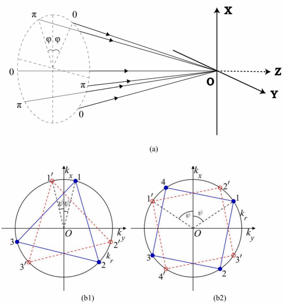 1 a) 六束准对称平面波干涉示意图;(b1)、(b2)六束或八束准对称平面波的横向傅里叶分量。六束或八束平面波可以分为两组对称平面波。