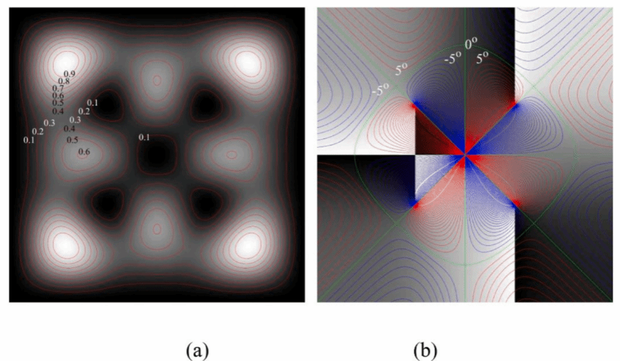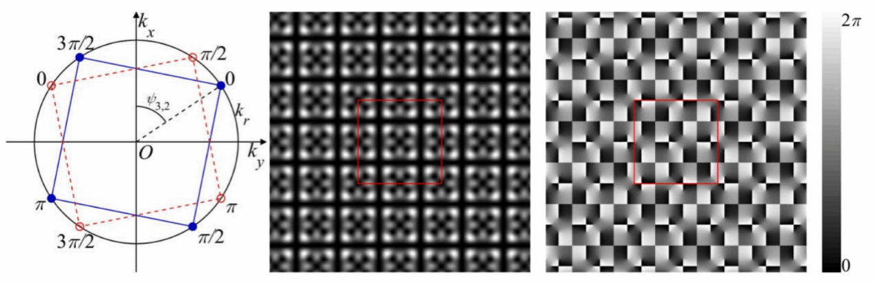 在这里,我们基于准对称结构,成功地实现了高拓扑荷高纯度的无衍射光学涡旋阵列的产生。通过六束准对称的平面波干涉,获得了拓扑荷为±2的三角形光学涡旋阵列,通过八束准对称的平面波干涉,获得了拓扑荷为±3的正方形光学涡旋阵列。