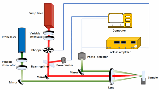 采用表面热透镜技术的测量装置可以分为分光路与共光路两种,其中分光路装置测量精度高,但光路复杂且调节难度大,同时易受环境影响,共光路装置简单、易调节,但装置参数固定、测量精度相对较低。针对该问题提出了共光路装置改进设计,通过泵浦光束与探测光束平行入射并利用透镜聚焦实现二者焦斑重合。基于改进技术搭建了图1所示的单透镜测量装置并对光学薄膜样品并进行测量,结果与分光路相比较为接近。单透镜设计在保证分光路优势的前提下简化装置、节省装置成本,减少调试环节、降低调试难度,并在一定程度上消除环境对装置的影响,对于保证吸收测量准确度、制备低损耗高性能的光学薄膜元件具有重要意义。