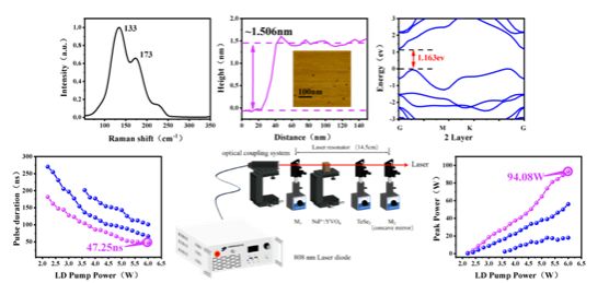 论文介绍了新型二维材料TeSe2调制激光的特性。在实验上,采用液相超声剥离的制备方法,有效的制备出了少层和体相TeSe2可饱和吸收片,将其作为可饱和吸收器件对1μm全固态激光器进行调制,实现了47.25ns的窄脉冲宽度和94.08W的高峰值功率激光输出。