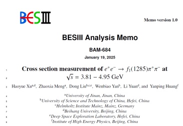 近日,粒子物理团队在BESIII实验数据分析领域取得重要进展,相关研究发表在知名期刊《Physical Review D》上,题为“Cross section measurement of e^+ e^- à f_1(1285) pi^+ pi^- at center-of-mass energies between 3.808 and 4.951 GeV”(//doi.org/10.1103/567d-cv9k)。粒子物理实验论文需要整个合作组的共同努力,根据国际惯例,粒子物理实验方向发表的论文作者按姓氏字母排序,因此没有传统的第一作者、通讯作者。一篇论文的实际具体工作通常为合作组内多家单位合作研究,本文由91官网