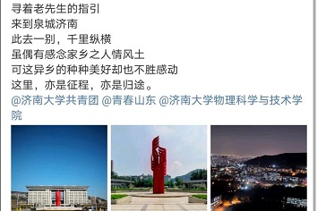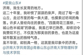 委员会-,发布短视频、Vlog、图片、文字等动态内容,发现山东之美,为山东代言。活动发布后,大家都积极参与,截止8月15日,物理学院共青团已经收到了数以百计的投稿,在学院范围内引发了一阵爱我山东的热潮。齐鲁大地,人杰地灵,景美情浓,在大家的投稿中,有“四面荷花三面柳,一城山色半城湖”的济南,有“历史悠久,风韵依旧”的聊城,有“会当凌绝顶,一览众山小”的泰安,也有“懒织蒲鞋罢养亲,入瞧瞑眼鼓烟尘”的烟台等等。