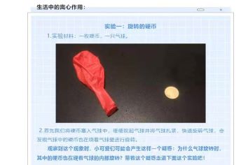 本次线上科普活动包含两个实验。实验一:旋转的硬币。志愿者通过演示硬币在快速旋转的气球中也会进行旋转现象引起小朋友们对旋转气球中的硬币也会旋转的疑问。随后,志愿者向小朋友们展示了实验二:高脚杯中的乒乓球。发现乒乓球也会跟着外面旋转的高脚杯而旋转起来。在此过程中,志愿者也在不断引导小朋友们动脑思索,最后用简单易懂的语言向小朋友们解释了这一神奇的离心作用并向小朋友们例出了我们生活中一些常见的离心作用的具体表现。