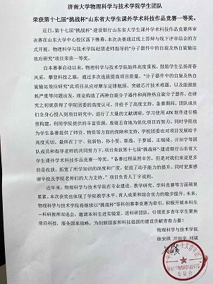 始终高度重视,鼓励学生弘扬青春风采,攀登科技之巅,通过多次选拔提高项目质量。“分子器件中的自旋及热自旋输运效应研究”此项目从应对摩尔定律瓶颈、突破芯片技术难题,以及能源损耗严重等问题出发,理论构造了两种自旋分子器件和两种热自旋分子器件,在研究之初就获得了学院团委的高度认可,并给予了高度支持。备赛期间,团队成员们全身心投入到项目研究中,进行了大量的文献调研,学习使用ATK软件进行模型构建,利用学院提供的丰富资源,废寝忘食地为优化项目而努力。同时学院也为学生备赛提供了师资、物资等方面的保障和支持,学校团委也对项目发展给予高度关切。最终在丁宇、张新怡、孙小雯、郭逸、于梦瑶、王瑞琦、亓田宇等团队成员和指导老师的共同努力下,项目荣获第十七届“挑战杯”·建设银行山东省大学生课外学术科技作品竞赛一等奖。“备赛过程虽然辛苦,但是对我们来说更多的是收获,拓宽了所学知识的深度和广度,促进了动手能力的提升。同时更要感谢学校及学院老师们的大力支持。”项目负责人丁宇说到。